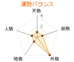 | 外格とは、総格から人格を引いた数です。家族・職場などの外因的要素、対人関係・社会的環境の運勢を表します。一字姓、一字名の場合、天の恵みとして霊数1を加えます。 | |