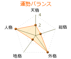 | 人格とは、姓の最後と名前の最初の画数合計です。名前の中心にあたる部分で、家庭・仕事・結婚運、二十代くらいまでの運勢を表し、主運とも言われます。 | |